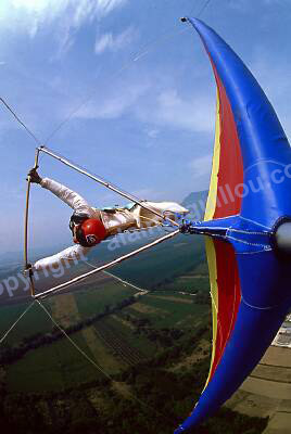 Légende UK: Alain Guillou performs an aerobatic hang lgiding flight.